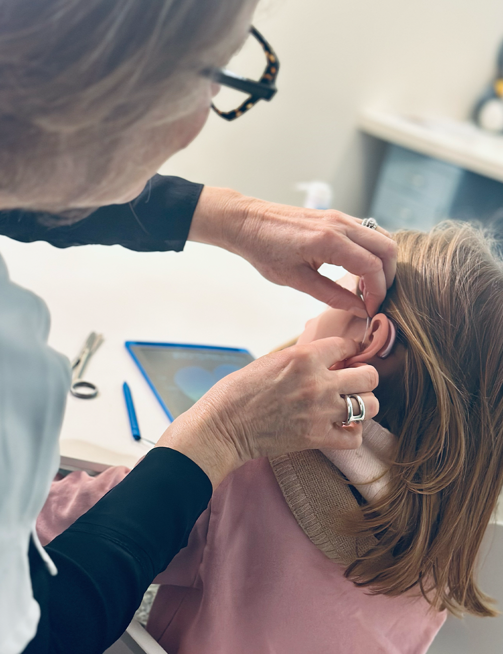 Au cours de ce rendez-vous l’audioprothésiste choisira le modèles d’aides auditives, réalisa les empreintes des oreilles et pourra répondre aux nombreuses questions des parents.